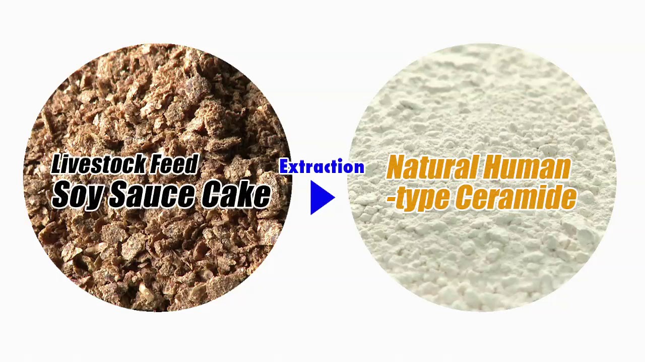 - For the first time in the world, we established a technology to purify natural human ceramide, which is a raw material for cosmetics, from soy sauce lees of high purity and stability. After extraction, the soy sauce lees can be used as livestock feed.